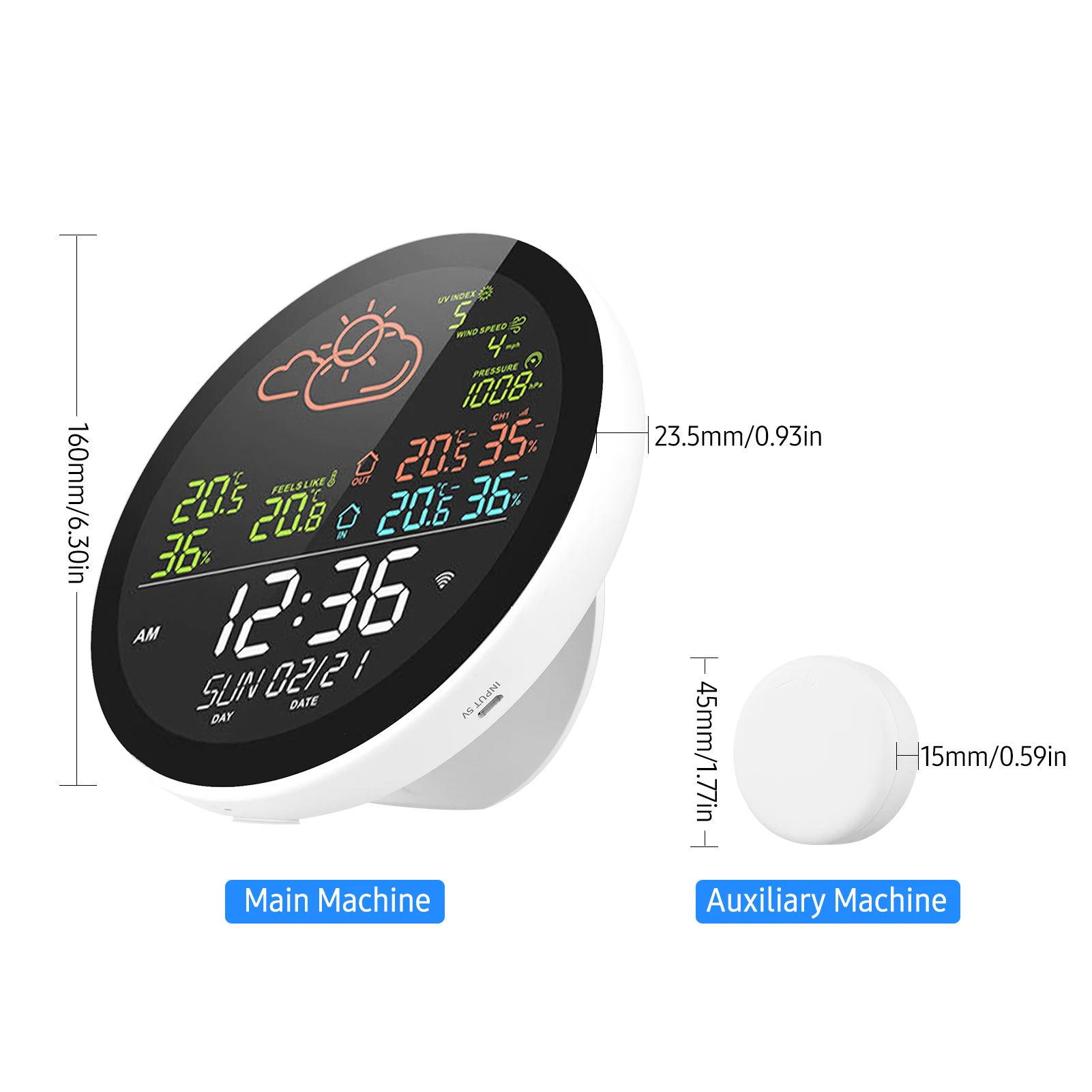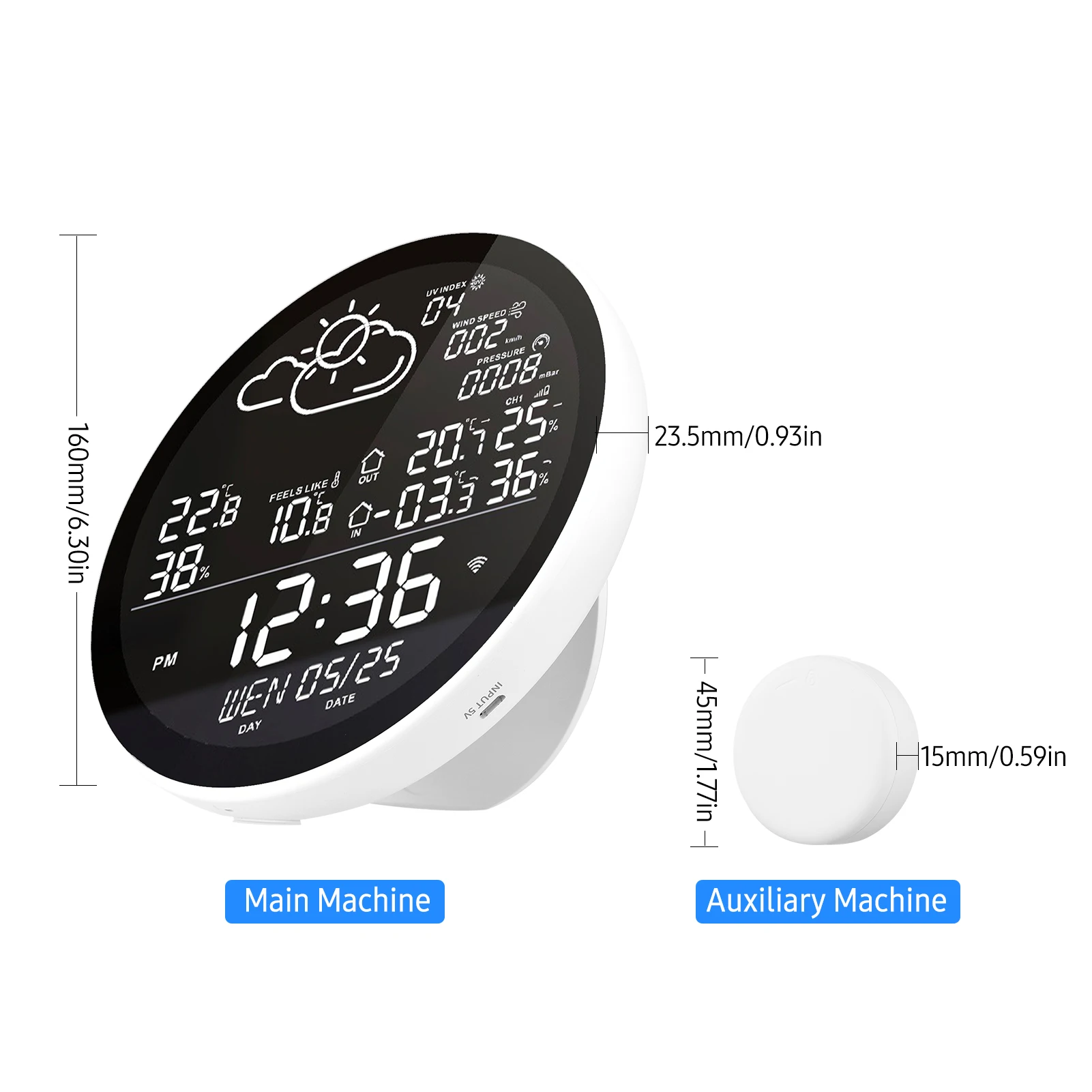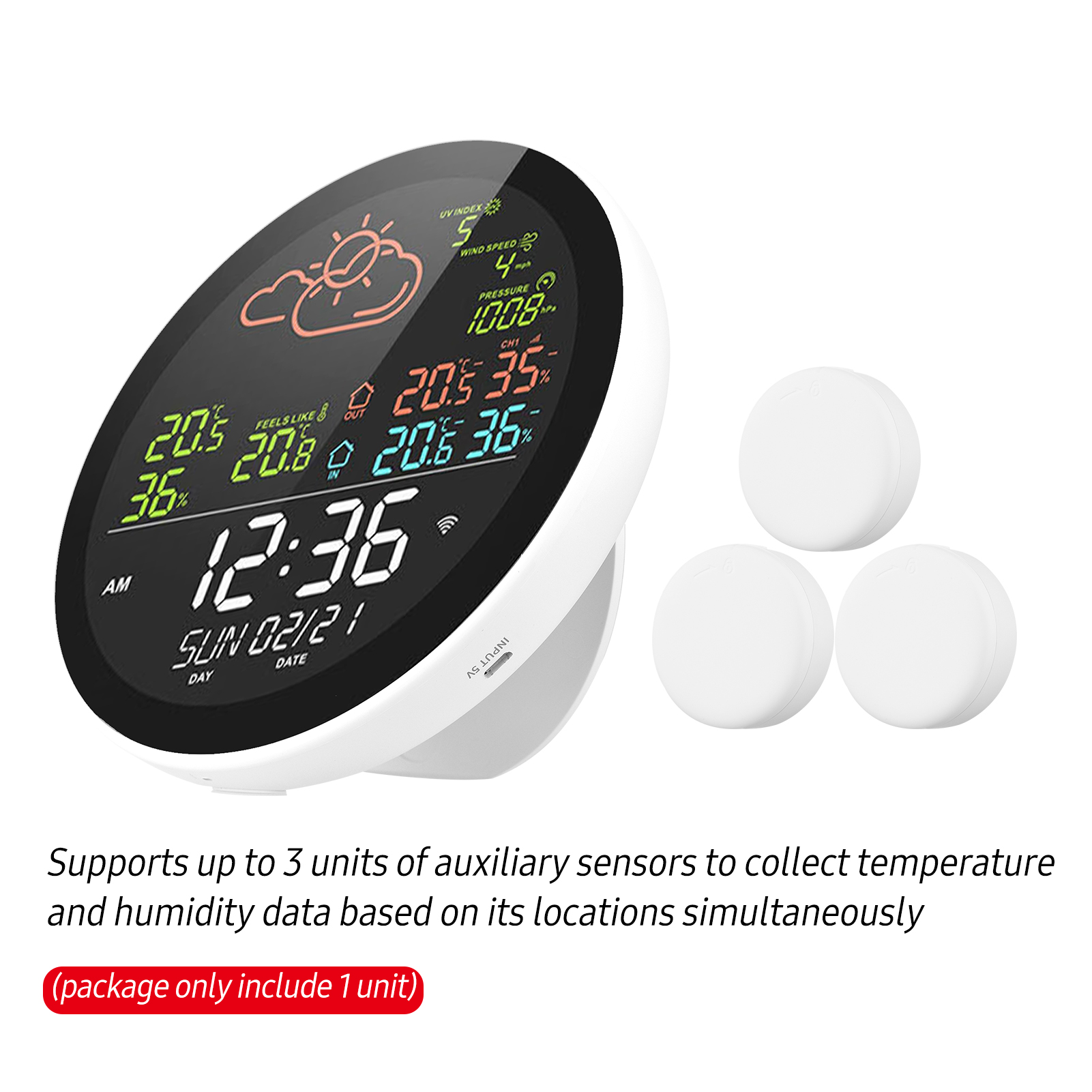 This smart weather station with clock collects weather data via internet to display weather information,time,date,temperature and humidity based on its location. Every main machine connects up to three auxiliary machines(package include 3 unit). Place the auxiliary machine indoor or outdoor, the collected data will be transmitted and displayed to the main machine indoor.You can also configure and control it via your phone, and check the weather data, indoor/outdoor temperature history data from the APP or the main machine indoor.
