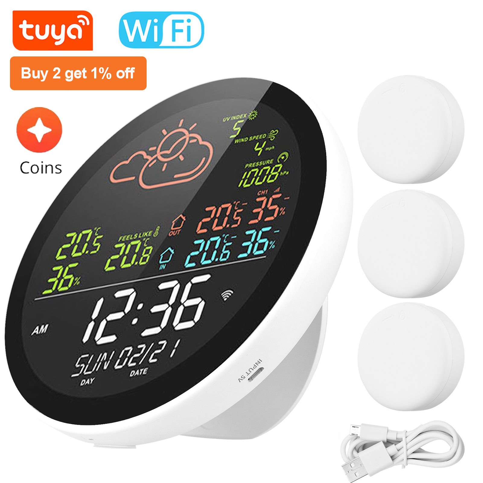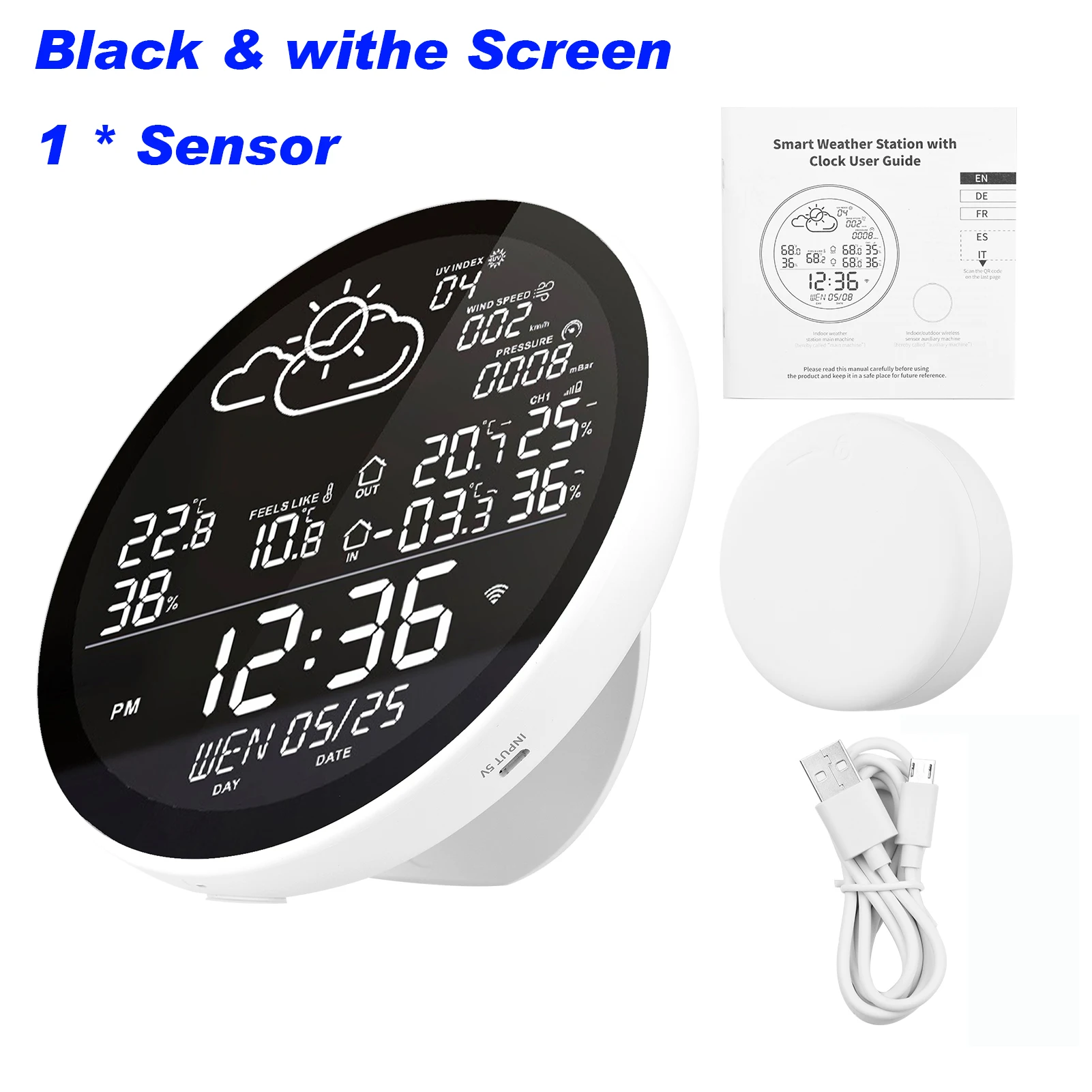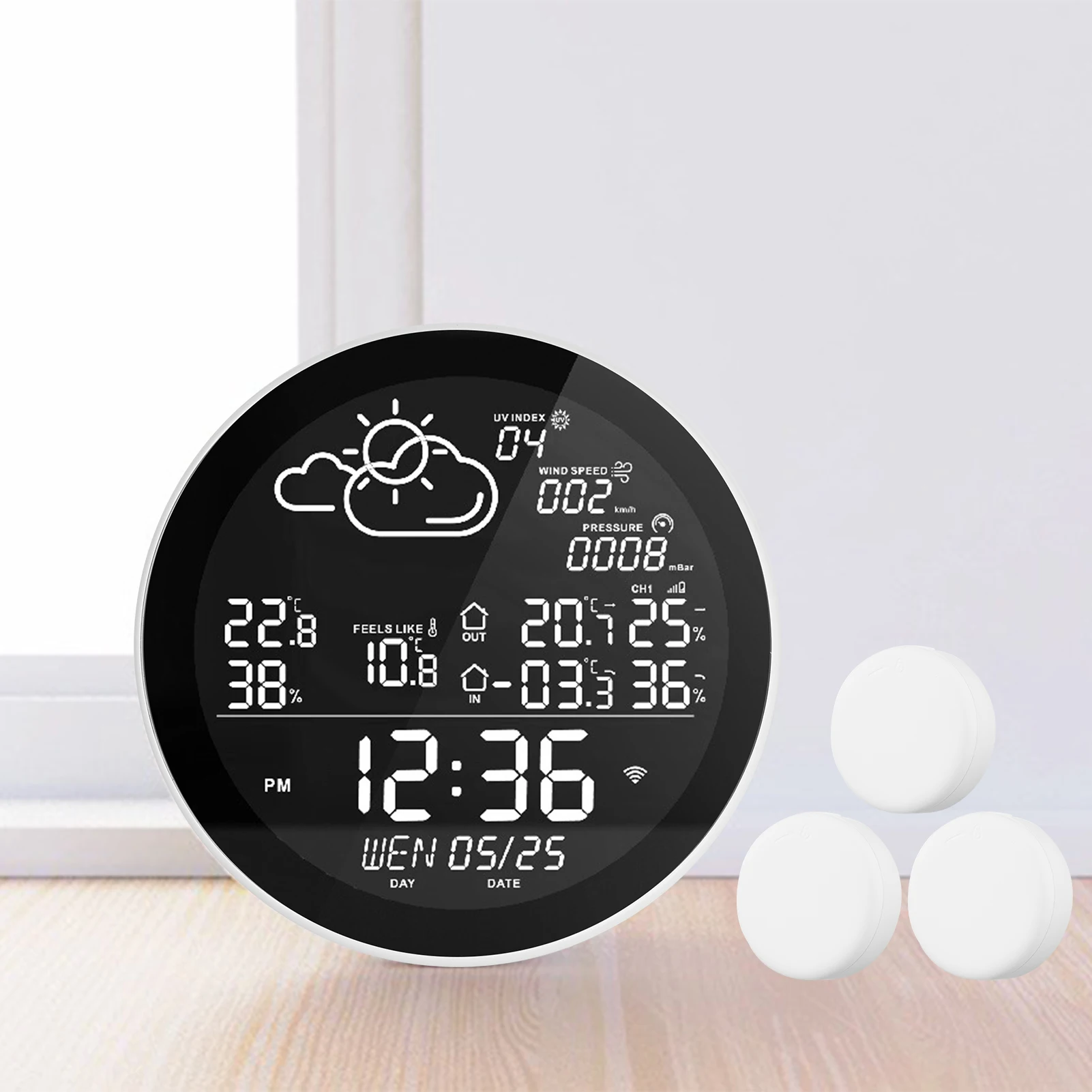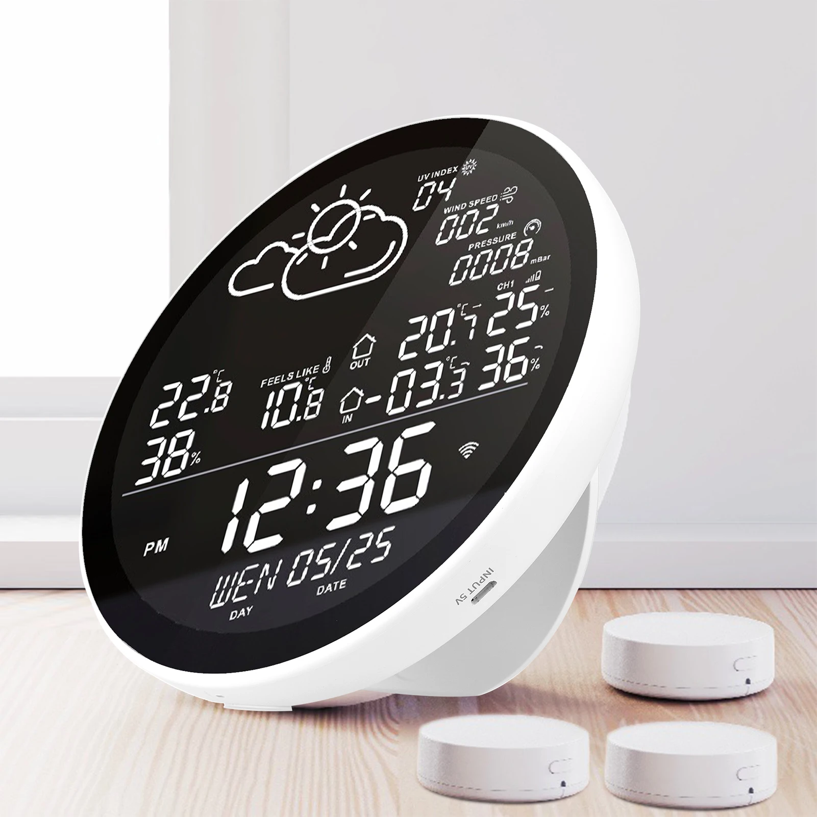 This smart weather station with clock collects weather data via internet to display weather information,time,date,temperature and humidity based on its location. Every main machine connects up to three auxiliary machines(package include 3 unit). Place the auxiliary machine indoor or outdoor, the collected data will be transmitted and displayed to the main machine indoor.You can also configure and control it via your phone, and check the weather data, indoor/outdoor temperature history data from the APP or the main machine indoor.